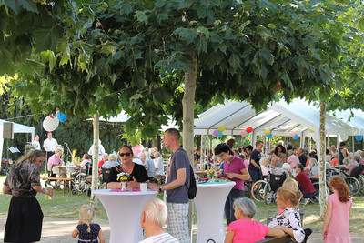 Bei Sonnenschein feierten und falnierten die Besucher unter den schattigen Bäumen des Parks. Für musikalische Unterhaltung sorgte unter anderem ein Auftritt der Kita Schweinfurter Weg. Für die Kleinsten gab es ein buntes Kinderprogramm mit Kinderschminken und Abenteuerparcours. Das Quartiersmanagement stellte an seinem Stand aktuelle Aktivitäten für die Nachbarschaft vor. Auch für das leibliche Wohl war bestens gesorgt.